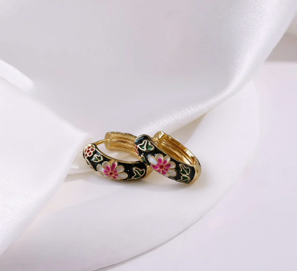 Verleihen Sie Ihrer Schönheit mit Blumenmustern noch mehr Eleganz. Material: Messing, vergoldet; Blumenteile emailliert. Nickelfrei und wasserfest. Maße: Länge 2 cm, Breite 2.5 cm